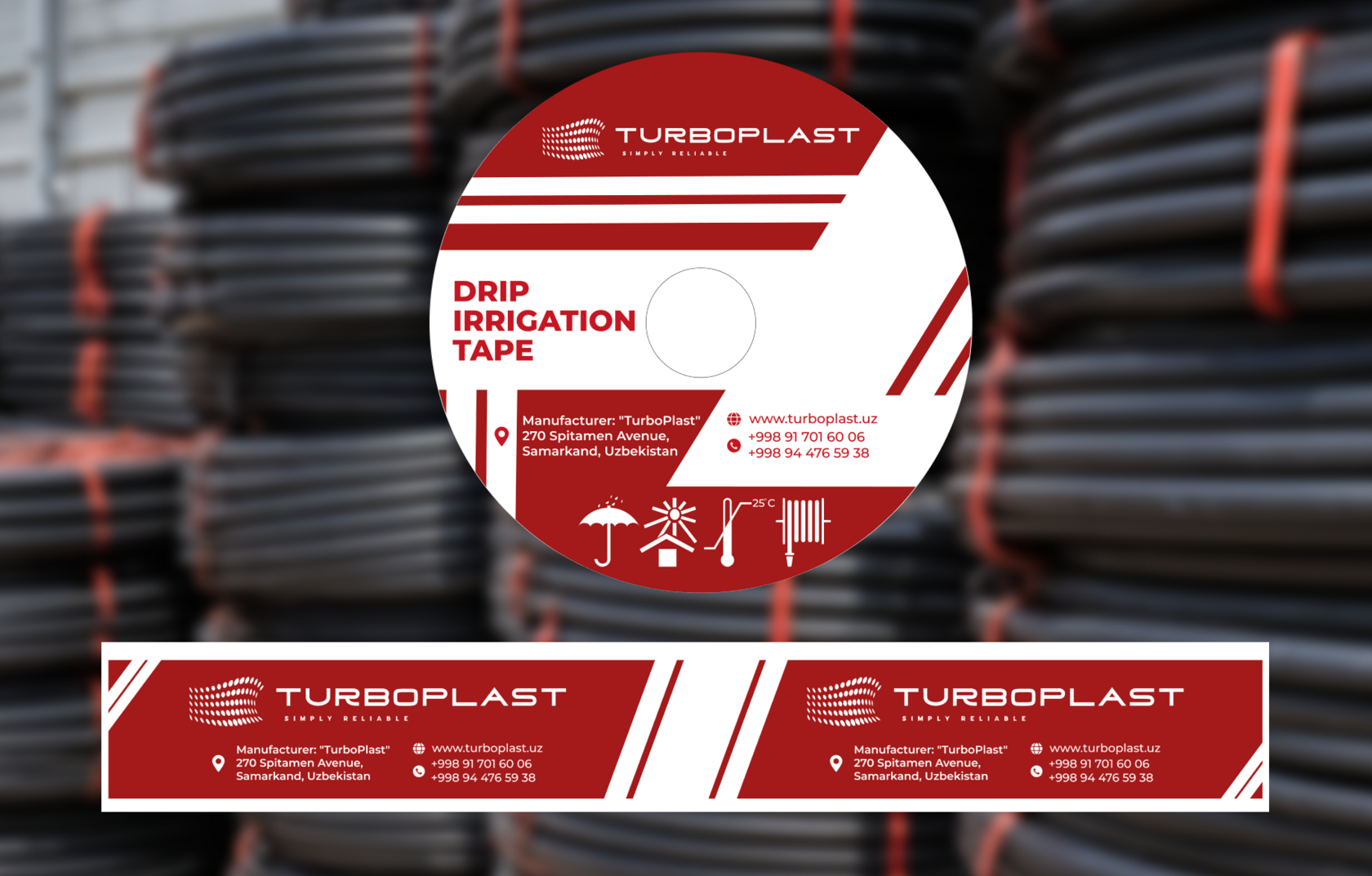 Turboplast bizga ularning asosiy mahsuloti — drip irrigation tape (tomchilatib sug‘orish lentalari) uchun qadoqlash dizaynini yangilashni topshirdi. Asosiy vazifa — qadoqlash mahsulotni himoya qilish bilan birga, “Simply Reliable” (sodda va ishonchli) degan shiorni aks ettirishi kerak edi. Mahsulot dehqonlar va sug‘orish mutaxassislariga mo‘ljallangan, shuning uchun dizayn tushunarli, har qanday ob-havoga bardoshli va istalgan sharoitda o‘qilishi oson bo‘lishi kerak. Kataklar ko‘pincha ochiq maydonlarda yoki omborlarda saqlanadi, shu sababli biz suv, kir va ultrabinafsha nurlariga chidamli materiallar hamda ranglarni tanladik.
