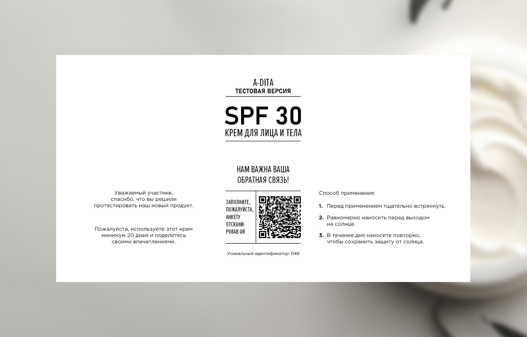 A-Dita brendi bizga SPF kremi qadoqlashini dizaynlash vazifasini topshirdi, u kundalik parvarishga mos bo‘lishi kerak edi. Mahsulot hashamatli ko‘rinishi, lekin oson yetib boradigan segmentda bo‘lishi lozim edi. Asosiy talablar: