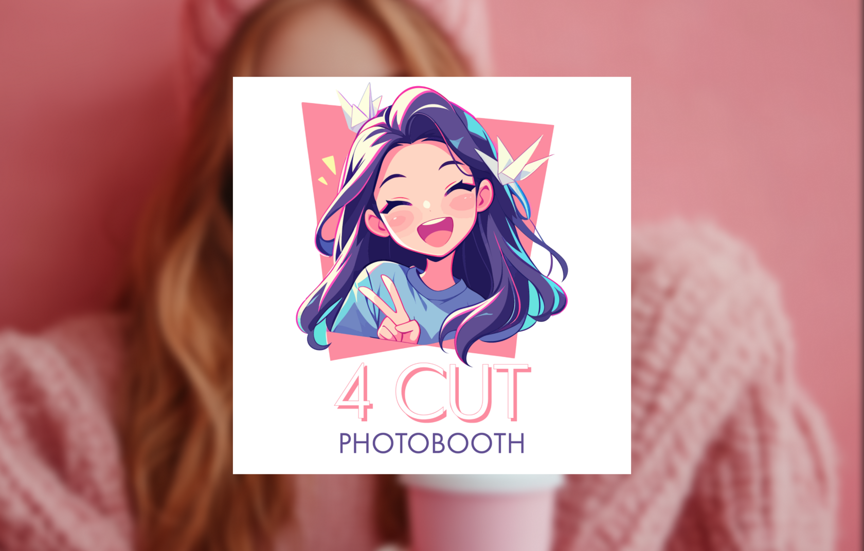 - Типография: Шрифт "4 CUT PHOTOBOOTH" — живой, с неоновыми переходами. "4 CUT" в интенсивном розовом, "PHOTOBOOTH" в приглушенном лиловом. Это вносит ритм, не заслоняя основное.