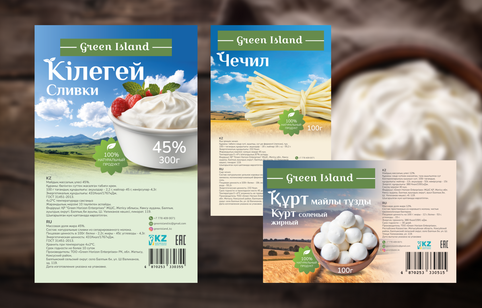 Bizning hamkorimiz Green Horizon Enterprises uch flagman mahsulot uchun dizaynni topshirdi: 45% yog‘li “Kipereni” qaymoq, tayoq shaklidagi “Chechil” pishloq va tuzlangan kurta shariklari. Asosiy jihat — 100% tabiiy mahsulotni ifodalash va brendni Qozog‘istonning avvalgi tabiiy landshaftlari bilan bog‘lash. Qadoqlash tokchalarda ko‘zga tashlanishi, eco-friendly auditoriyani jalb qilishi va eksport uchun EAC talablariga mos kelishi kerak edi.