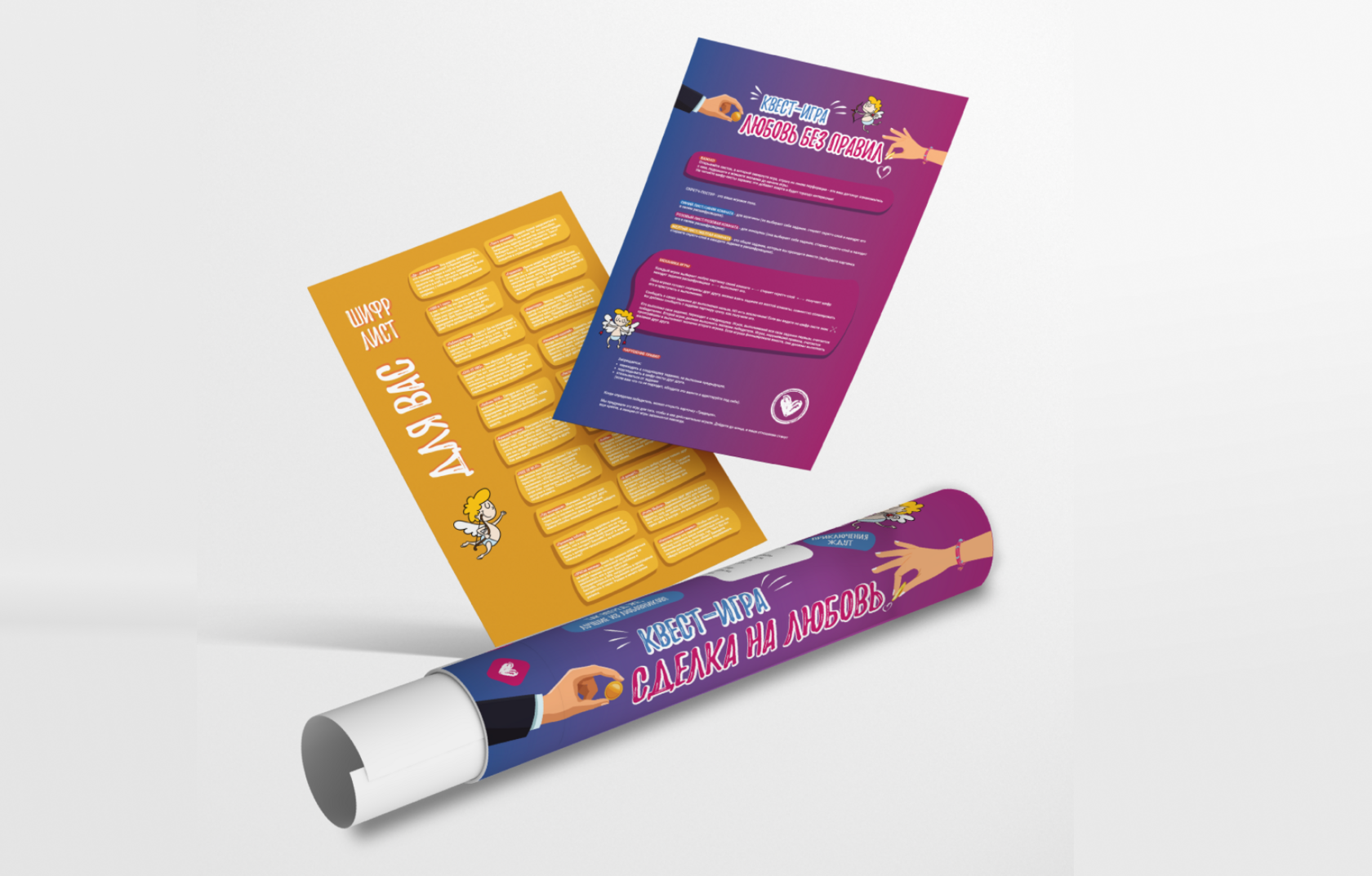 Romantik kvest qadoq dizaynida multfilmdagi farishtalar va qoʻllar chizmalari ishlatildi, ular "sevgi kelishuvi" tarixini engil hazil bilan hikoya qiladi. Tubus va plakatlarning binafsha rangi sirli atmosferani keltirib chiqaradi, sariq skretch-varaq issiqlik va dinamizmni kuchli kontrast orqali qoʻshadi. Shifrlash varaqlari tik panjarasi, xuddi kalendar kabi, 80 ta topshiriqni qamrab oladi. Qoʻl yozuvi uslubidagi shriftlar soʻzlarga iliqlik bagʻishlaydi, xuddi shaxsiy xatlar kabi. Natijada qadoq oddiy saqlash joyidan chiqib, oʻyin-kulgiga chaqiriqqa aylanadi va JIVU.GRUP mahsulotining oʻziga xosligini ta'kidlaydi.