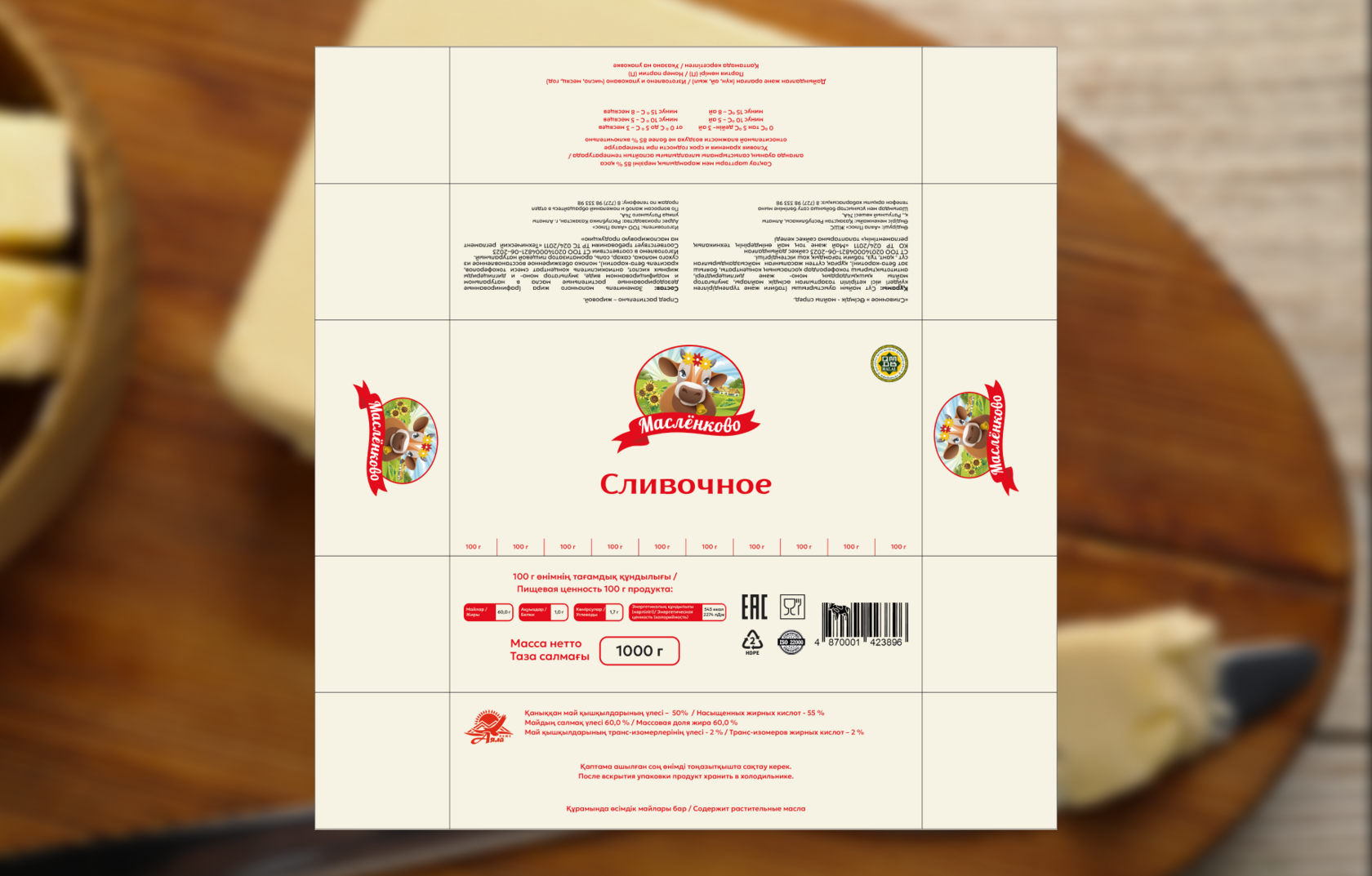 Tayyor versiya — 1000 grammli paket, logotip, tarkibi ( yog‘lar 82,5%, oqsillar 0,8% va boshqalar), kaloriyalik, muddatlar va "Ayala Plyus" kontaktlarini o‘z ichiga olgan qisqich bilan. U javonlarda yorqin logotip va iliq tonlar bilan diqqatni tortadi — mijoz sinov nuqtalarida savdoda 15% o‘sishni qayd etdi. Bu muvaffaqiyatli qadoqlash dizayni nafaqat ko‘rinishni, balki brendning mashhurligini ham kuchaytirishini tasdiqlaydi.