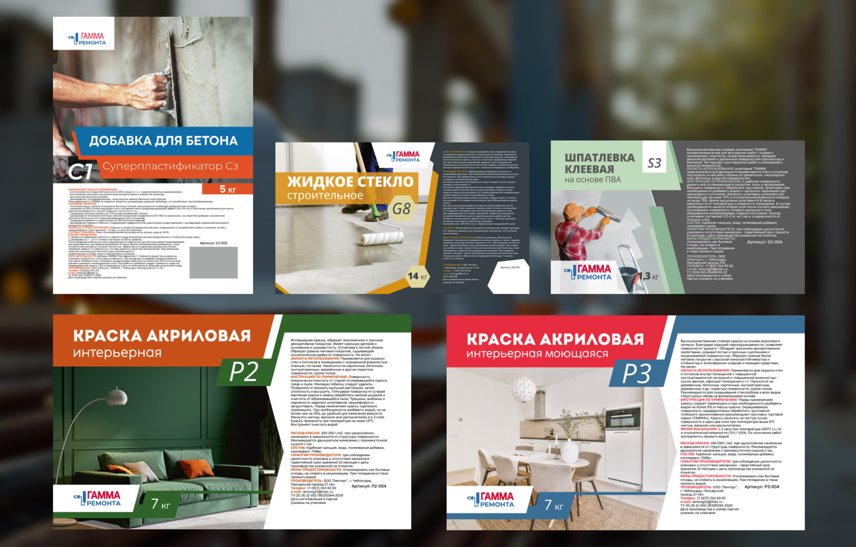 Mijoz bizga ichki ishlov berish uchun akril bo‘yoqlar, jumladan molotkoviy effektli bo‘yoqlar qadoqlashini radikal yangilash vazifasini berdi. Eski dizayn eskirgan edi: ortiqcha detal, mos kelmaydigan ranglar, tizimning yo‘qligi. Biz har bir elementning o‘ziga xosligini aks ettiruvchi, ammo umumiy brend uyg‘unligini saqlaydigan yagona dizayn asosini yaratdik — beton qo‘shimchalardan tortib, primerlar va shpaklyovkagacha.