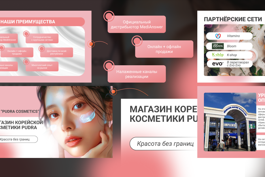 Afzalliklarni yetkazish kerak edi: onlayn + oflayn savdo, mashhur brendlar bilan hamkorlik, premium mahsulotlarga kirish va asosiy g‘oya — “chegarasiz go‘zallik”. Taqdimot nafaqat ma’lumot berishi, balki kerakli hissiyotlarni uyg‘otishi lozim edi.